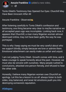 A Facebook user identified as Awuzie Franklin has shared an opinionated reflection following recent comments and testimony by Nollywood actress Tonto Dikeh, stating that her revelations have prompted a re-evaluation of the long-running public narrative surrounding her former husband, Olakunle Churchill.