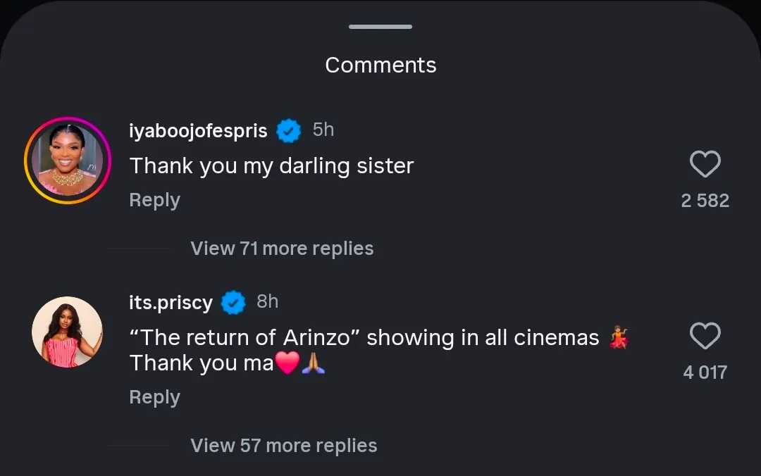 Her gesture didn’t go unnoticed, as Iyabo Ojo responded warmly in the comment section, appreciating the support and referring to Toyin as family. She replied: