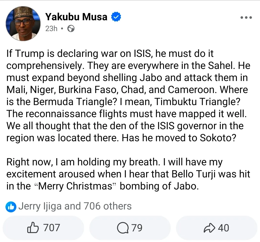 A Nigerian Journalist identified as Yakubu Musa has urged the US President to expand its attack on ISIS beyond Sokoto with immediate effect if he really wants to end terrorism.