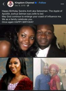 “Happy Birthday Sandra Areh aka Selwoman. The Apple of Apostle Joshua Selman eye (wife to be).”
