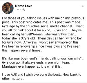 “Anyways I won’t say anymore on this.. I’ve been in fellowship since I was 6yrs and I’ve seen this happen several times. It’s like your boyfriend’s friends calling you “our wife”.. 6yrs don go.. it always ends in premium tears if Marriage never happens.. it is what it is.. “I love AJS and I wish everyone the best.. Now back to other matters.”
