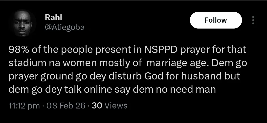 “98% of the people present in NSPPD prayer for that stadium na women mostly of marriage age. Dem go prayer ground go dey disturb God for husband but dem go dey talk online say dem no need man.”