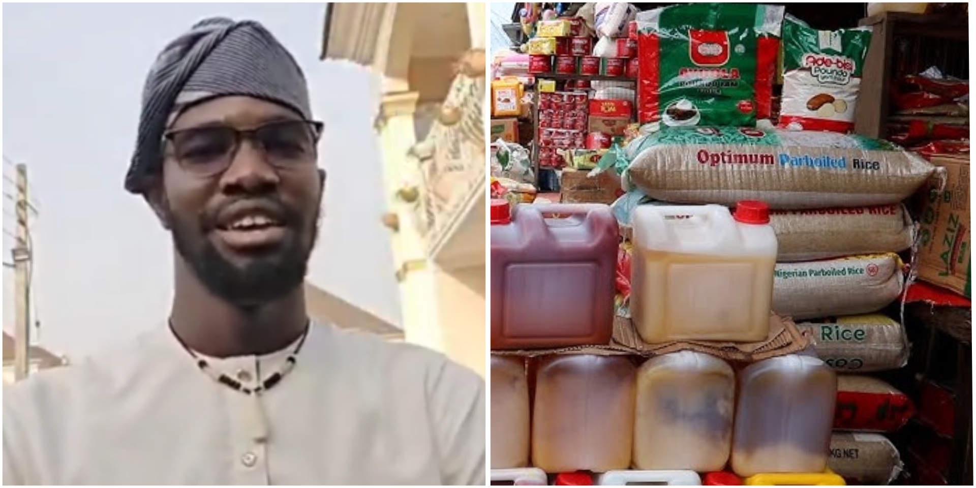 The items shared were said to include two bags of rice, cartons of Golden Penny soya oil, tins of Peak powdered milk, macaroni, spaghetti, Gino jollof tomato paste, Knorr seasoning cubes, as well as bags of sugar and semolina.