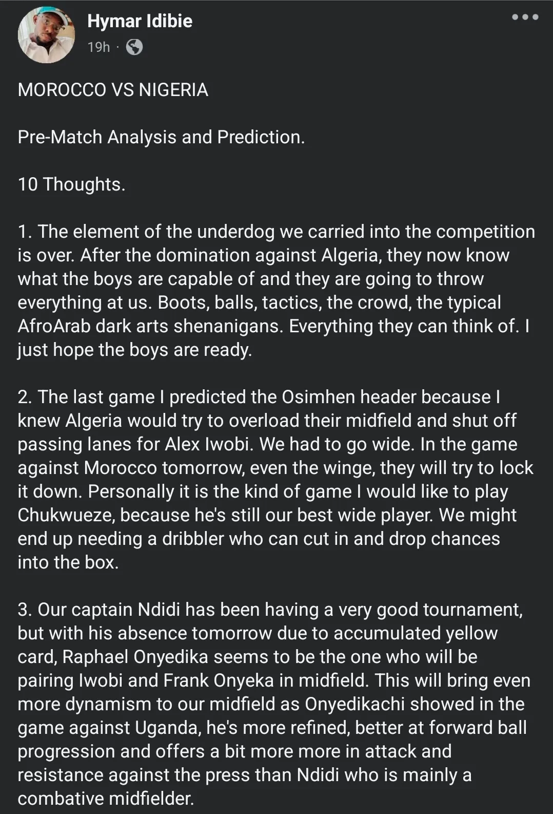 Hymar Idibie, a Nigerian lad known for his correct AFCON predictions and match analysis has weighed in on the highly-anticipated semi-final clash between Morocco and Nigeria.