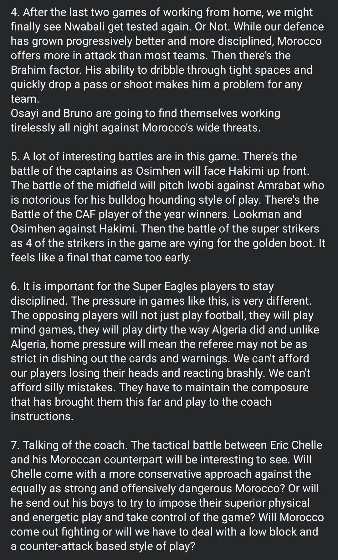9. A lot will be depending on Osimhen. A whole lot. Nigeria knows it. Morocco knows it. Association of Good Behaviour People Know it. National Association of Bench Him, He is Too Proud, know it. The whole of Africa knows it. Morocco President knows it. The two coaches know it. Osimhen himself knows it.