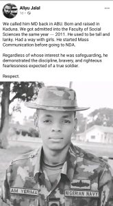 “We called him MD back in ABU. Born and raised in Kaduna. We got admitted into the Faculty of Social Sciences the same year – 2011. He used to be tall and lanky. Had a way with girls. He started Mass Communication before going to NDA.”