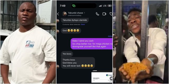 Tag the guy’s handle for me pls. I don’t like this, to be honest. I have something for him, biko. We pray make dem no give us jollof rice wey we no go fit eat. That’s very bad. The girl that shared this jollof rice should learn how to treat people with empathy and benevolence. Lack of money is the greatest source of disrespect.”