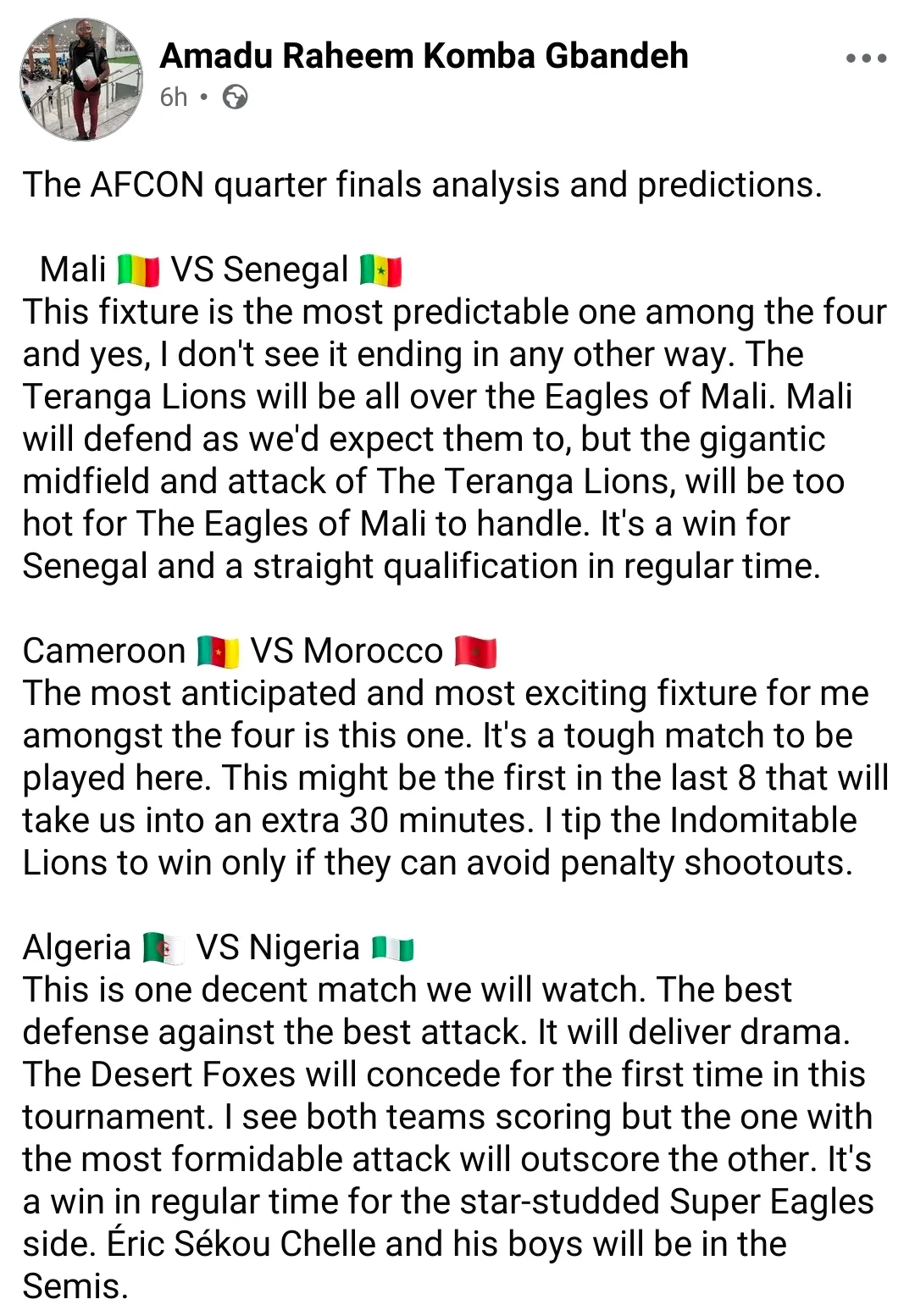 In a Facebook post on Thursday, January 8, Amadu stated that the match between Nigeria and Algeria would be a decent one.