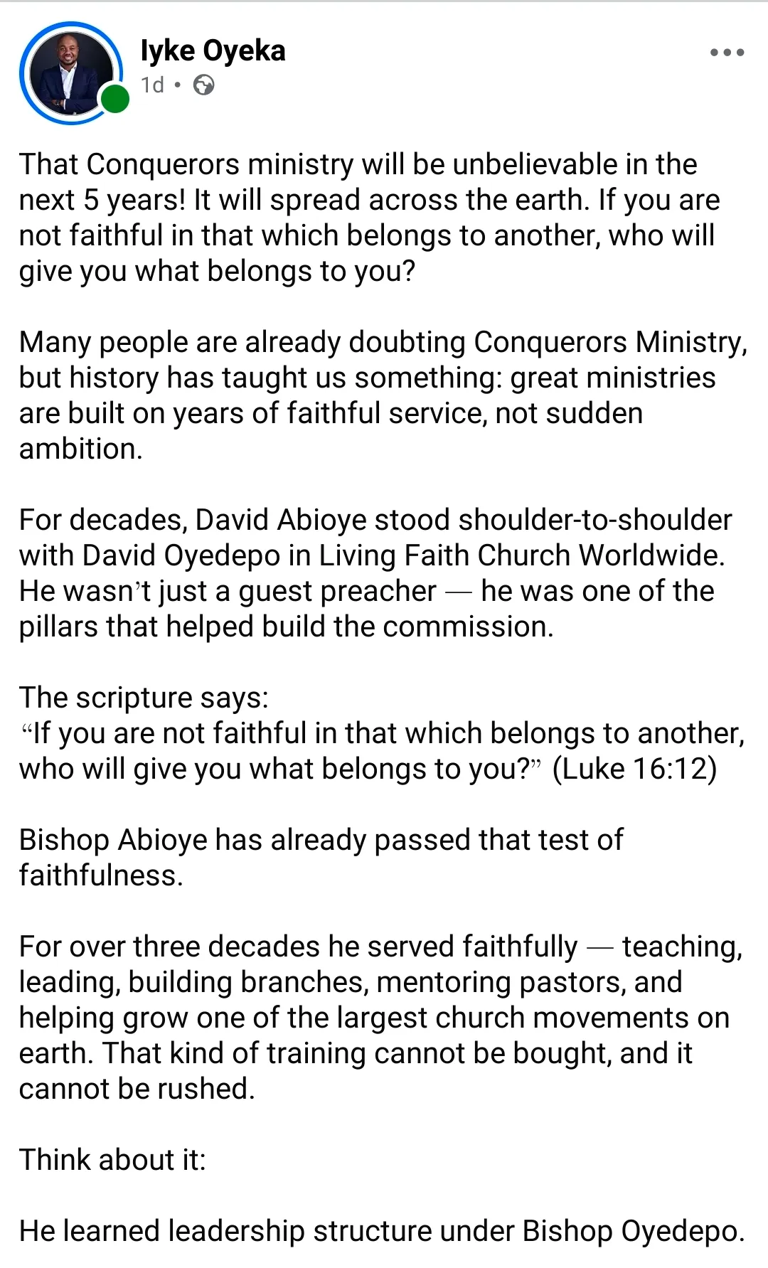 He also pointed out that Abioye spent many years working closely with David Oyedepo at Living Faith Church Worldwide, where he served as a key figure in the development of the ministry.