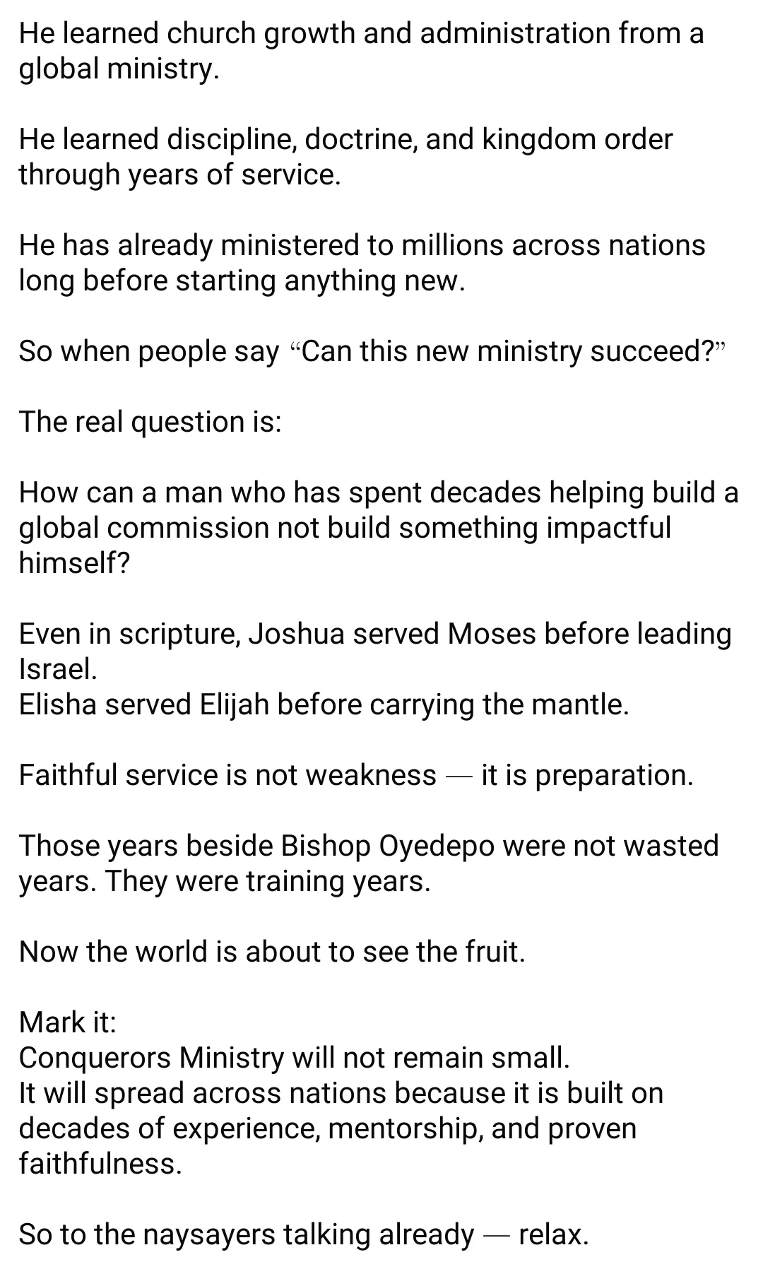 “Many people are already doubting Conquerors Ministry, but history has taught us something: great ministries are built on years of faithful service, not sudden ambition.