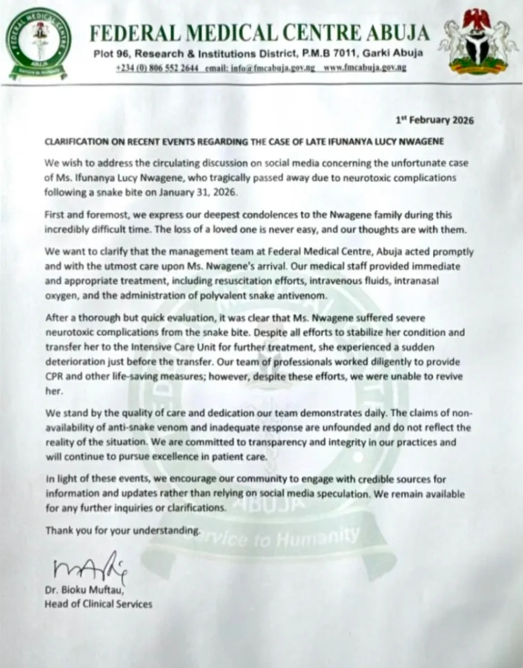 We want to clarify that the management team at Federal Medical Centre, Abuja acted prompthy and with the utmost care upon Ms. Nwagene’s arrival. Our medical staff provided immediate and appropriate treatment, including resuscitation efforts, intravenous fluids, intranasal oxygen, and the administration of polyvalent snake antivenom.