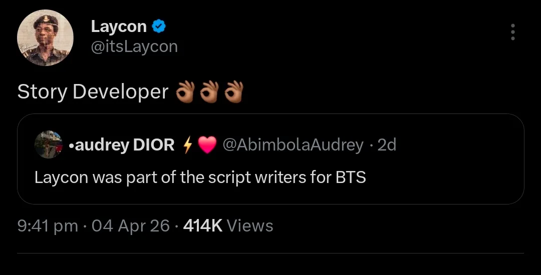 The individual’s identity was revealed after an X user identified as @AbimbolaAudrey made a post, stating that Big Brother Naija winner, Laycon was part of the script writers for Behind The Scenes.