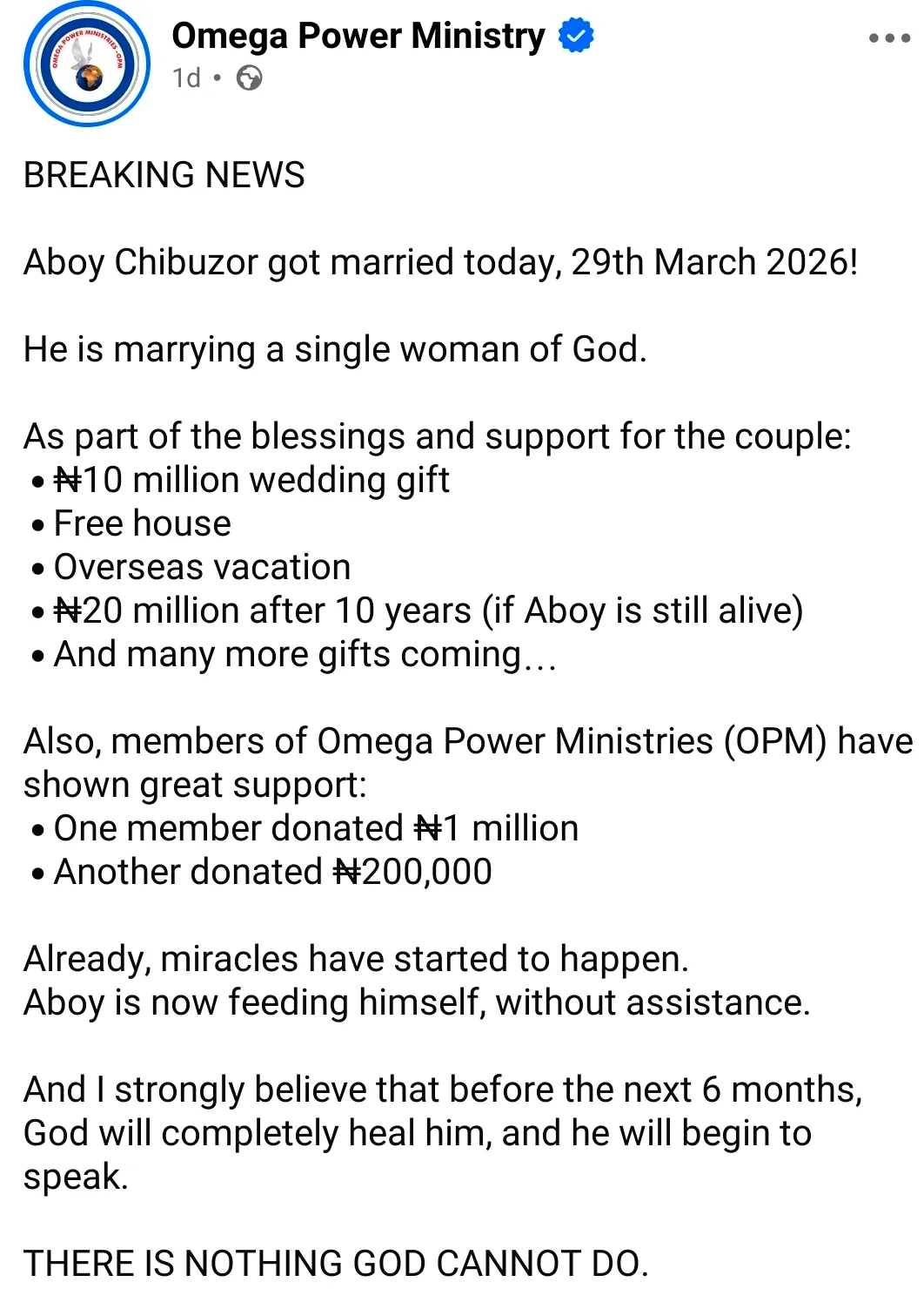 “Aboy Chibuzor got married today, 29th March 2026! He is marrying a single woman of God. As part of the blessings and support for the couple: ₦10 million wedding gift, Free house, Overseas vacation, ₦20 million after 10 years (if Aboy is still alive) And many more gifts coming.