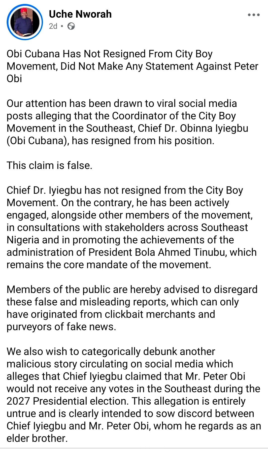 Beyond the resignation story, the statement also addressed another claim circulating online. According to the movement, there were reports alleging that Obi Cubana had stated that former Anambra State governor, Peter Obi, would not receive votes in the Southeast during the 2027 presidential election.