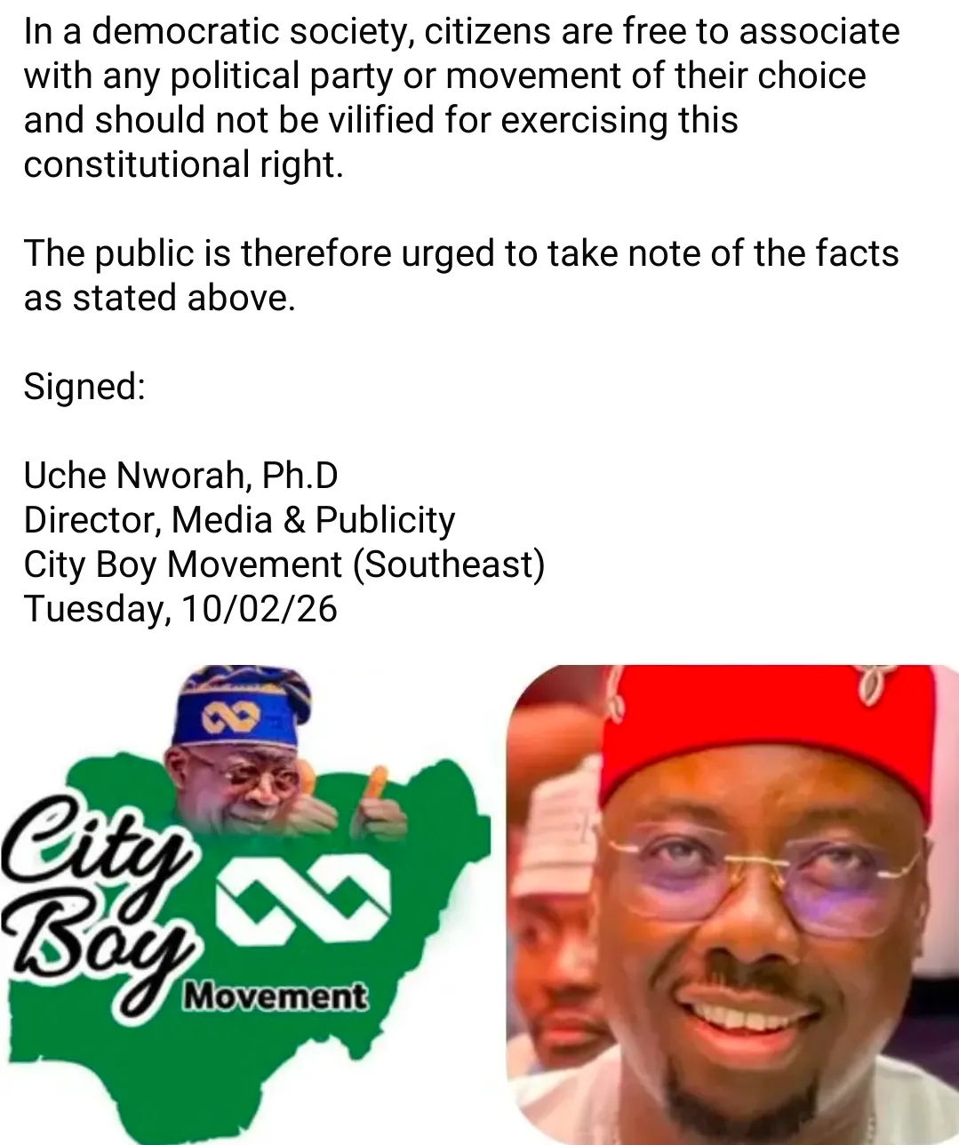 In a statement signed by Uche Nworah, Director of Media and Publicity for the City Boy Movement in the Southeast, the organisation described the resignation claims as false and misleading.