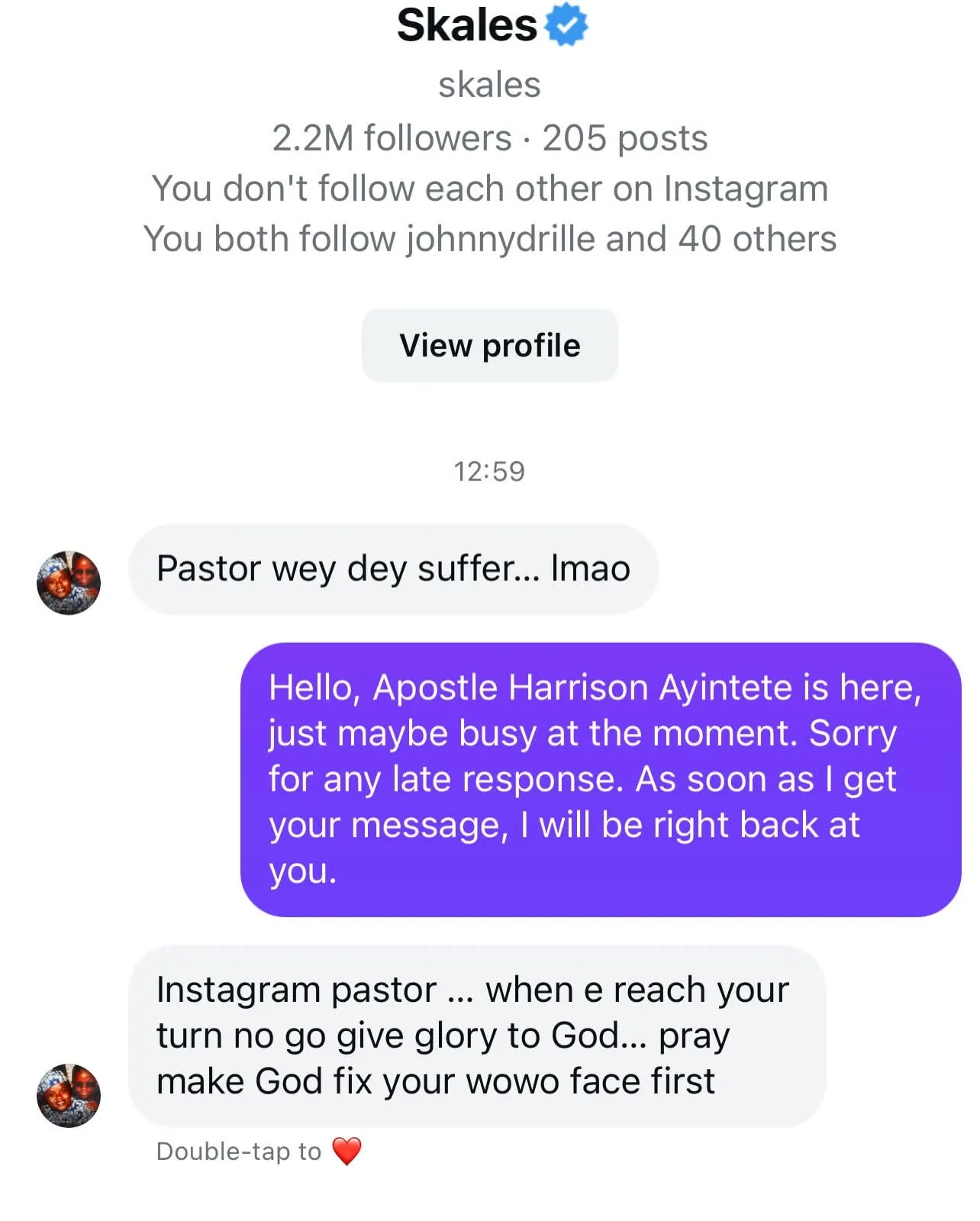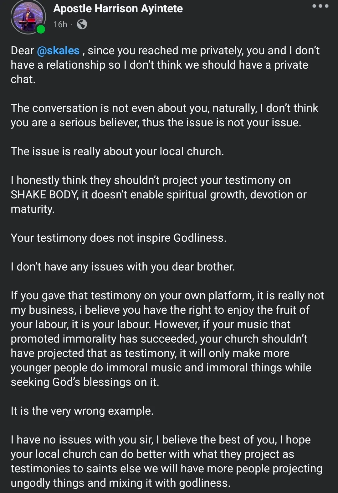 Sharing the screenshot online, Apostle Harrison Ayintete reiterated his initial statement, noting that Skales’ testimony does not inspire Godliness.