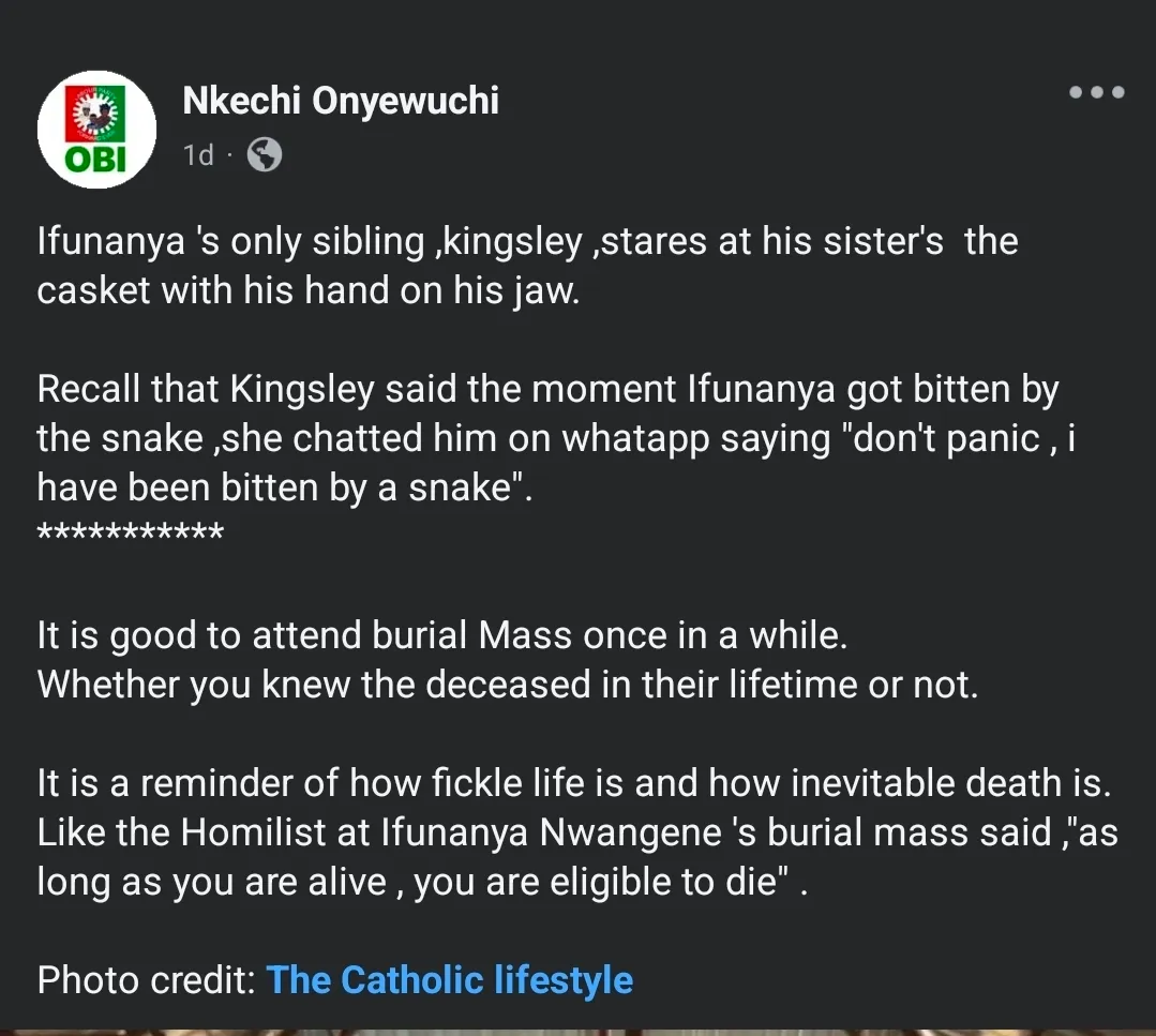 A Facebook user has shared a touching observation from the burial Mass of Ifunanya Nwangene, who reportedly died after a snakebite.
