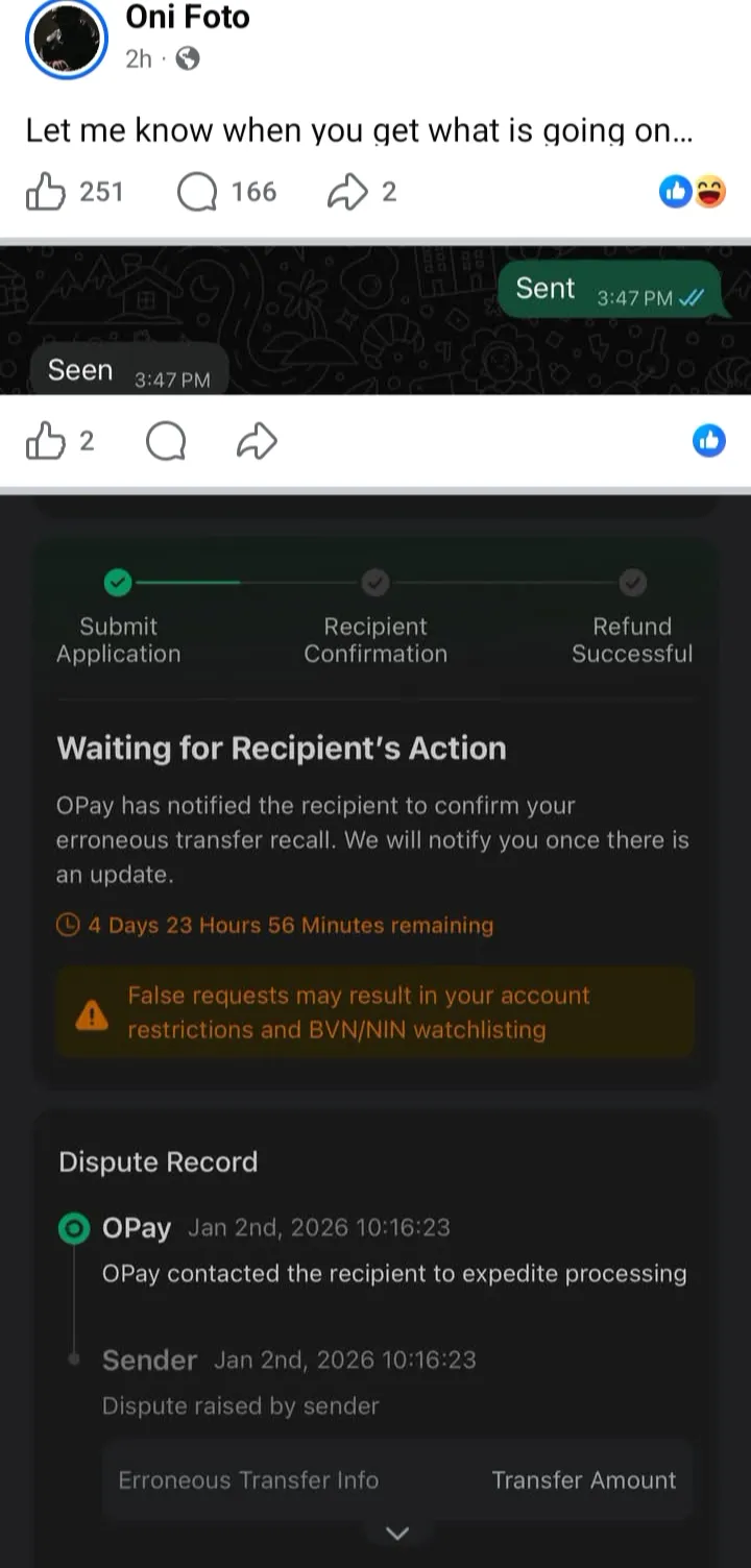 According to the uploaded screenshot, Oni Foto’s message “sent” was replied “seen” by the recipient who didn’t show any sign of gratitude after sending the sum of 20k through his Opay.