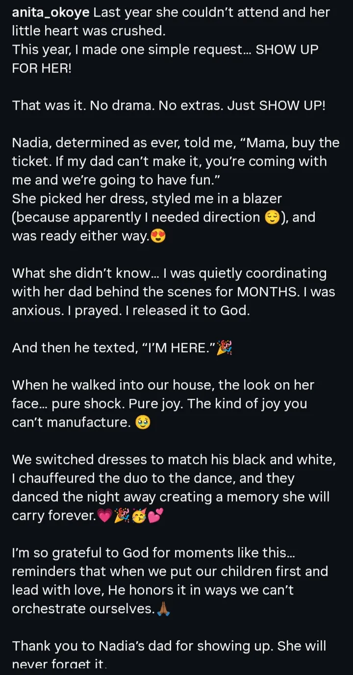 In her post, Anita Okoye recalled how her daughter’s heart was crushed last year by the absence of her father, during the previous “Daddy-Daughter Dance” event in Atlanta.