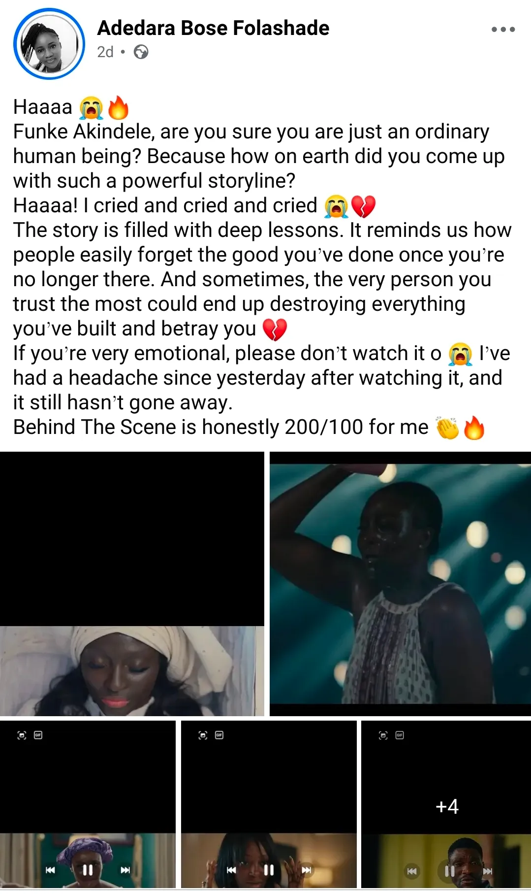 The woman, identified on Facebook as Adedara Bose Folashade, questioned Funke Akindele’s creativity while reflecting on the film’s message.