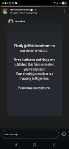 Nollywood actress, Sarah Martins recently reshared a post made by an Instagram user @iamdrbea on her Instagram story, debunking rumors about her (Sarah Martins) arrest.