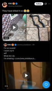 A Nigerian lady identified as @omo_olobikan on X ( formerly Twitter) took to her handle to cry out profusely during the late hours of November 1st 2025 after spotting a snake in her toilet.