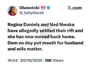 “Regina Daniels and Ned Nwoko have allegedly settled their rift and she has now moved back home. Dem no dey put mouth for husband and wife matter.”