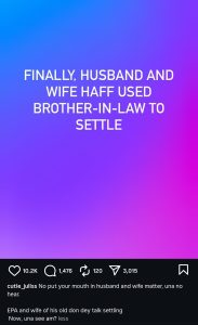 No put your mouth in husband and wife matter, una no hear. EPA and wife of his old don dey talk settling Now, una see am?”