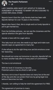 “LADY SANDRA AREH MUST GET APOSTLE TO SIGN AN AGREEMENT OF PROMISE TO MARRY OR SHE IS BOUND TO LOOSE HER LEGAL STAND.