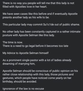 As a prominent single pastor with a lot of ladies already dreaming of marrying him, Apostle Selman should be conscious of public opinion on his rather close relationship with this lady, those pictures and gestures, which people have noticed come yearly on her birthday, should be avoided.Â