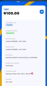 The first image is my transfer receipt to Martins Vincent Otse Initiative which is the sum of N100, while the second image is a screenshot of the credit alert on the NGO website showing the money I sent which came in merely 57 seconds after I sent it. Check both dates which is 25/10/2025.