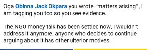 The NGO money talk has been settled now, I wouldn’t address it anymore. anyone who decides to continue arguing about it has other ulterior motives.
