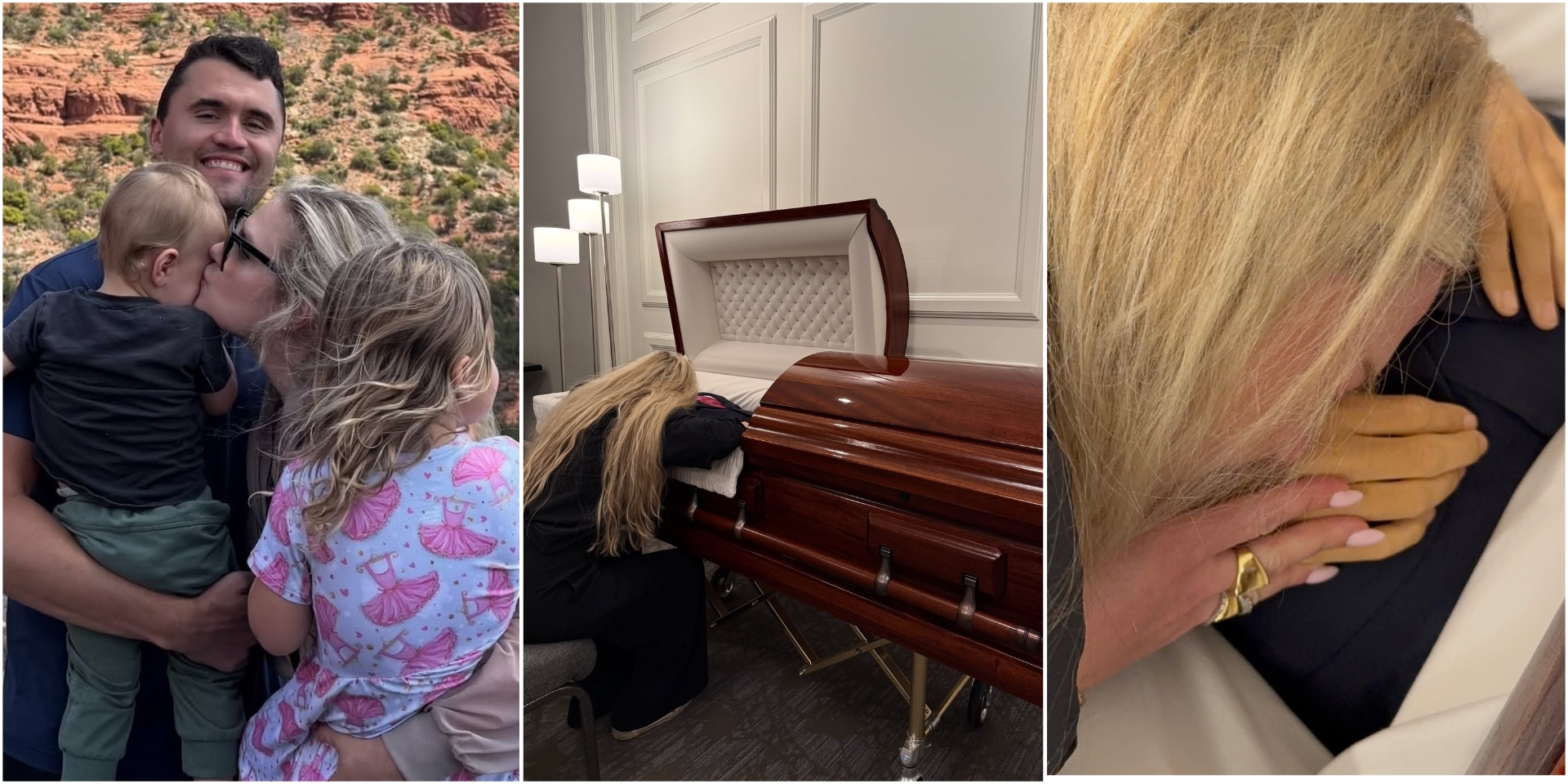 A wife weeping with head bent over husband’s open casket – the soul-wrenching picture was shared by Charlie Kirk’s wife, Erika, on social media on Friday.