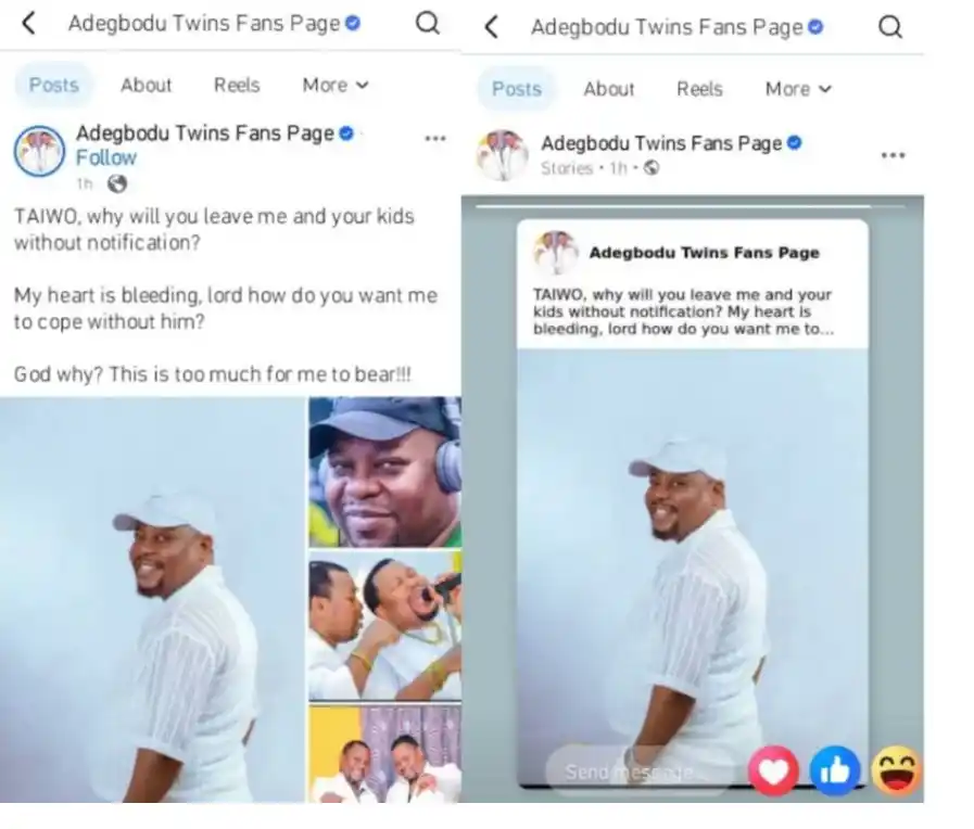 “Taiwo, why will you leave your kids and me without notification? My heart is bleeding, Lord, how do you want me to cope without him? God why? This is too much for me to bear!”, the post read.