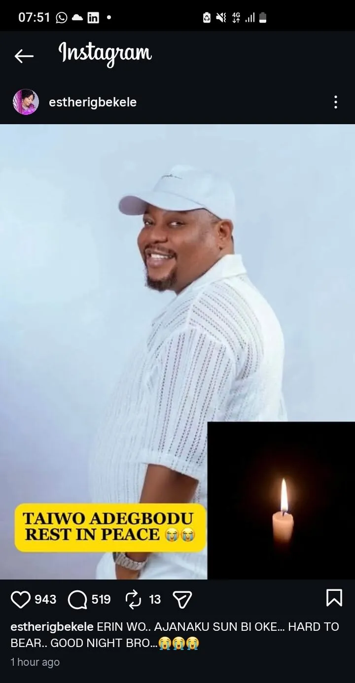 Igbekele posted the singer’s picture with the caption, “Erin wo, Ajanaku sun bi oke. Hard to bear. Goodnight, bro.”
