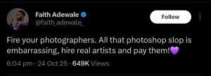 Taking to X (formerly Twitter), Faith bluntly advised his colleagues to sack their photographers, insinuating that their photoshopped images are embarrassing.