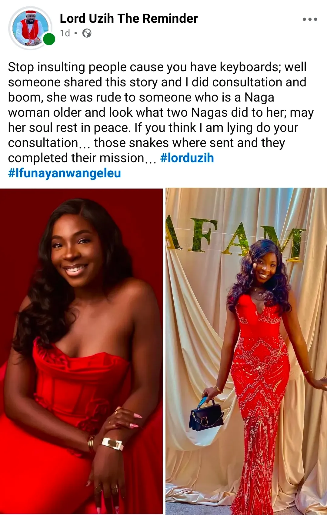 Stop insulting people cause you have keyboards; well someone shared this story and I did consultation and boom, she was rude to someone who is a Naga woman older and look what two Nagas did to her; may her soul rest in peace. If you think I am lying do your consultation… those snakes were sent and they completed their mission…”