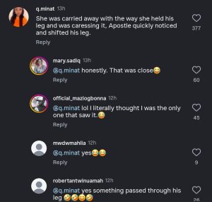 However, an IG user, @q.minat upon watching the clip shared an observation. She averred that Lady Sandra was carried away with the way she held and caressed the clergyman’s leg and when he noticed it, he immediately shifted.