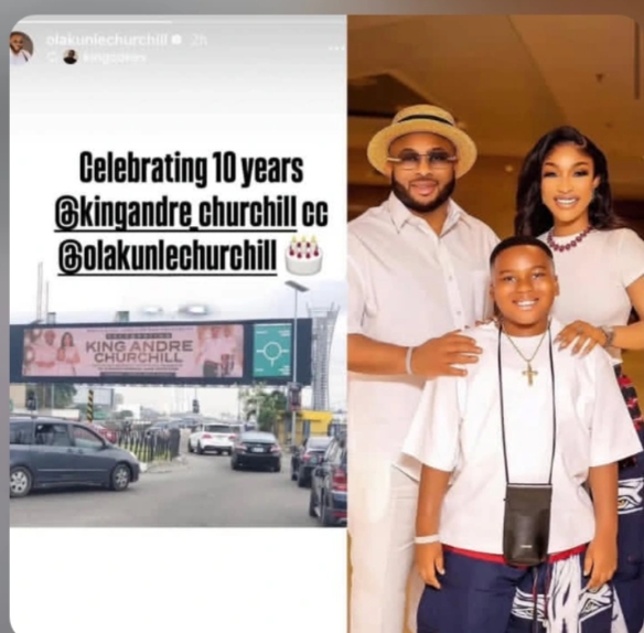 Olakunle Churchill shared a picture of a billboard featuring a picture of himself, his ex-wife, and their son, together with another bold picture of the celebrant.