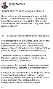 Because he retired from formal leadership in Living Faith Church in October 2024, his involvement in official events like Shiloh naturally stopped.