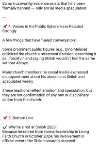 Some prominent public figures (e.g., Dino Melaye) criticized the church’s retirement decision, describing it as “forceful” and saying Shiloh wouldn’t feel the same without Abioye.