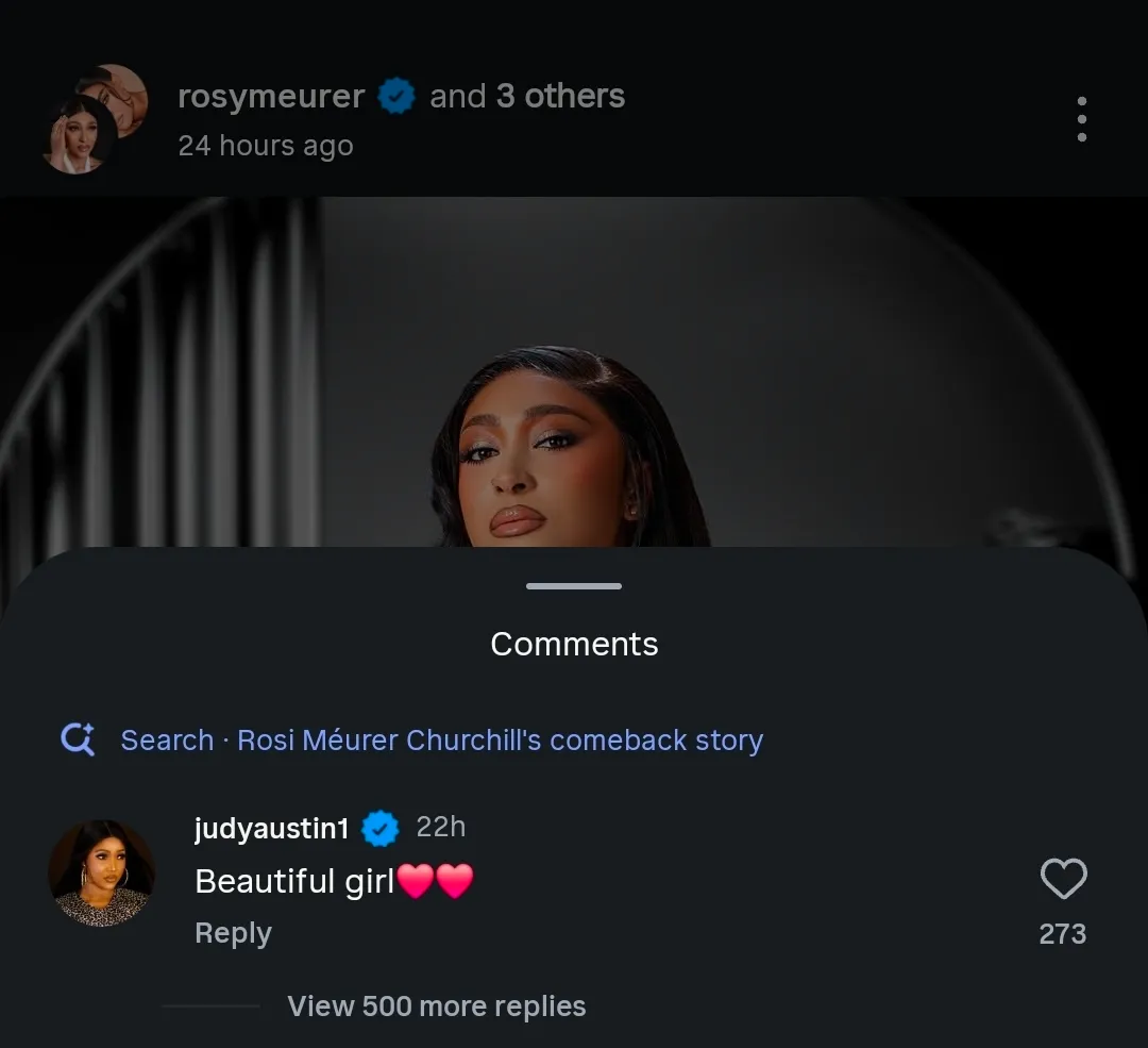 Nollywood actress Judy Austin, the second wife of actor Yul Edochie, has publicly shown support for her colleague Rosy Meurer amid ongoing rumours surrounding her marriage to businessman Olakunle Churchill.