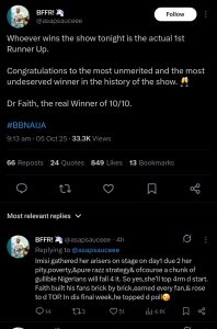 Congratulations to the most unmerited and the most undeserved winner in the history of the show. 🥂 Dr Faith, the real Winner of 10/10. #BBNAIJA.”