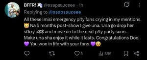 “All these Imisi emergency p!ty fans crying in my mentions. 😹 Na 5 months post-show I give una. Una go drop her s0rry a$$ and move on to the next p!ty party soon. Make una sha enjoy it while it lasts. Congratulations Doc. 💜 You won in life with your fans.💜🥹”