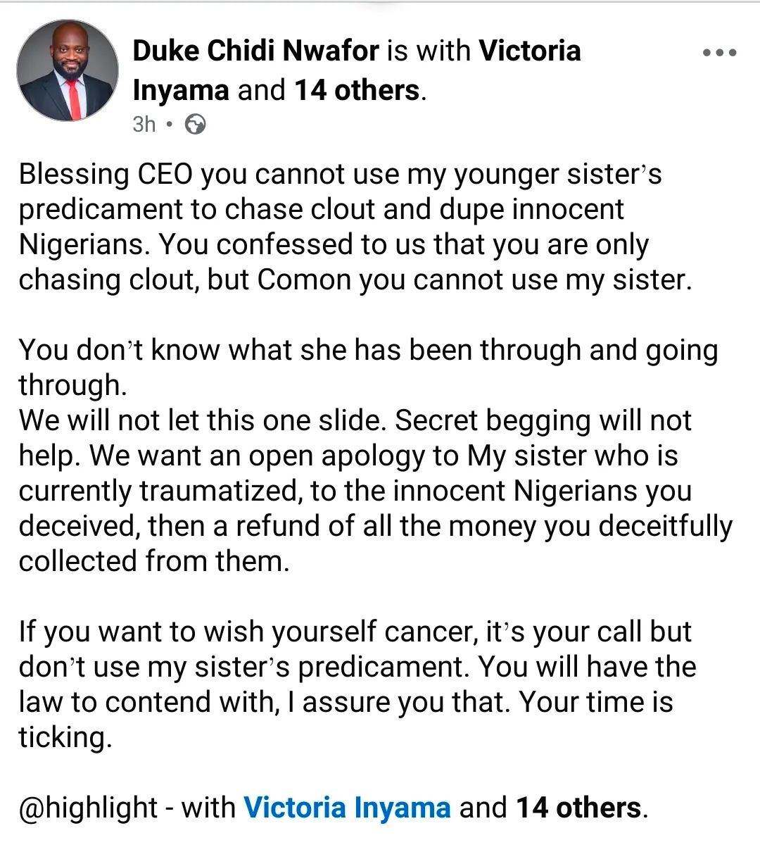 We will not let this one slide. Secret begging will not help. We want an open apology to My sister who is currently traumatized, to the innocent Nigerians you deceived, then a refund of all the money you deceitfully collected from them.