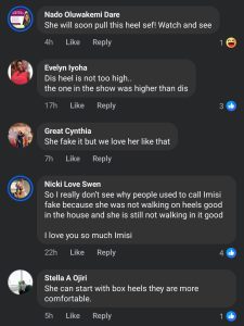 Imisi who was previously a subject of discussion in the house due to how she fell on the floor after attempting to rock heels got people talking again after they spotted her wearing heels.